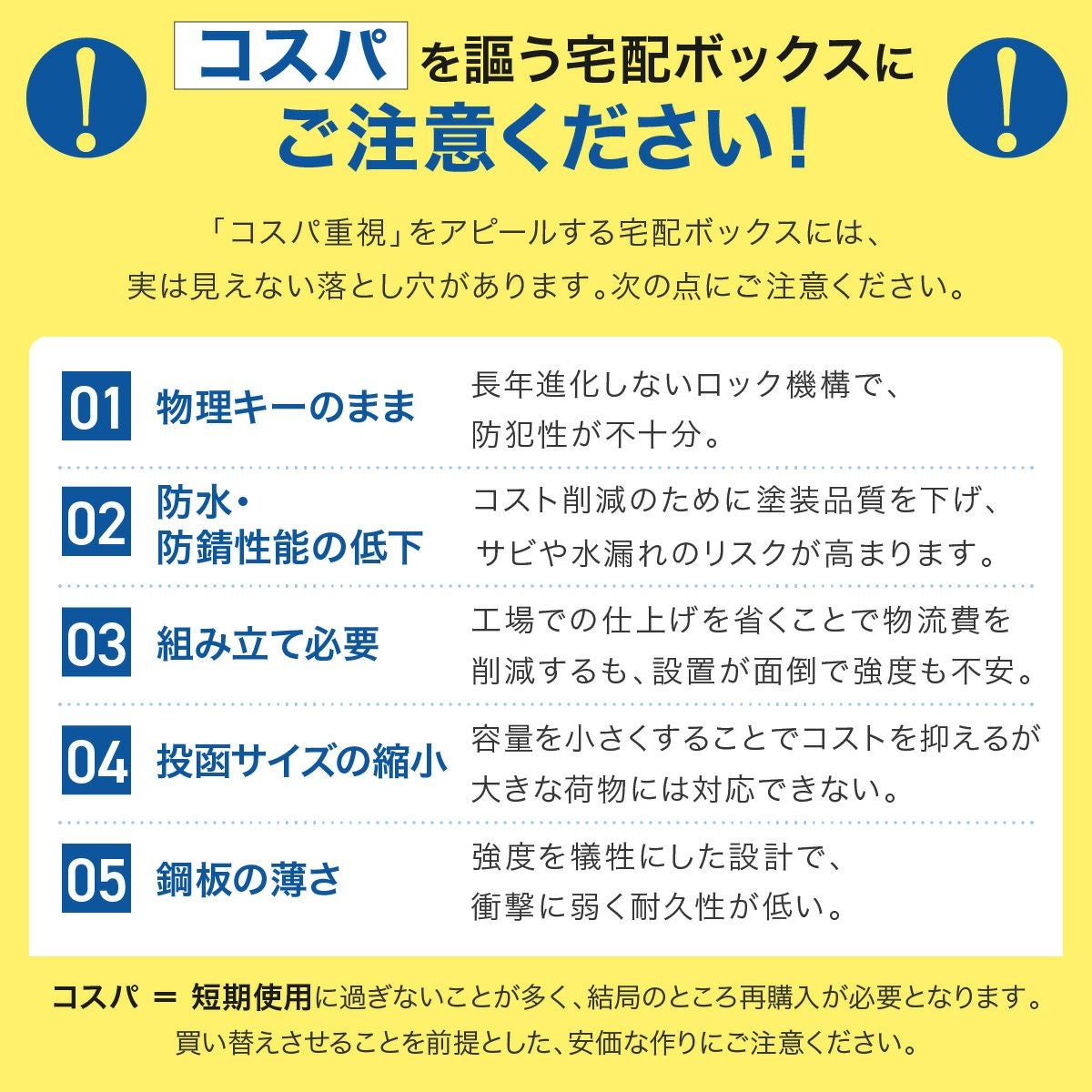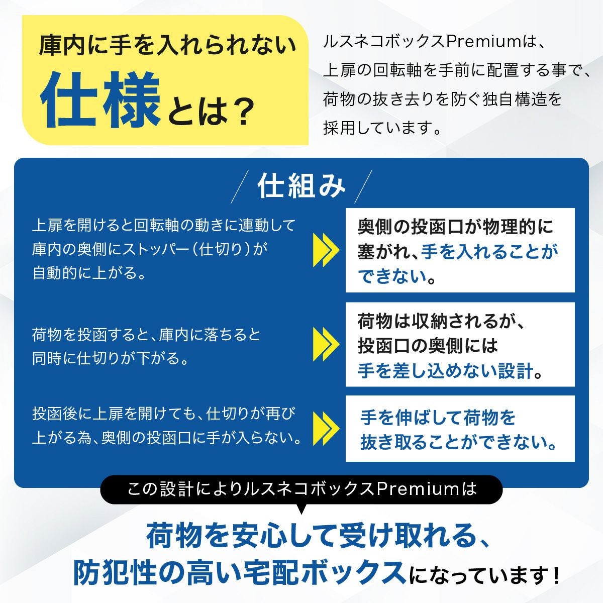 他の画像を見る 人気商品 8%OFF Premiumシリーズ ポスト付き 宅配ボックス ルスネコボックス Premium【専用ベースセット】 通常価格 ¥ 110,000 のところ 販売価格 ¥ 50,563 税込 お気に入りに登録する