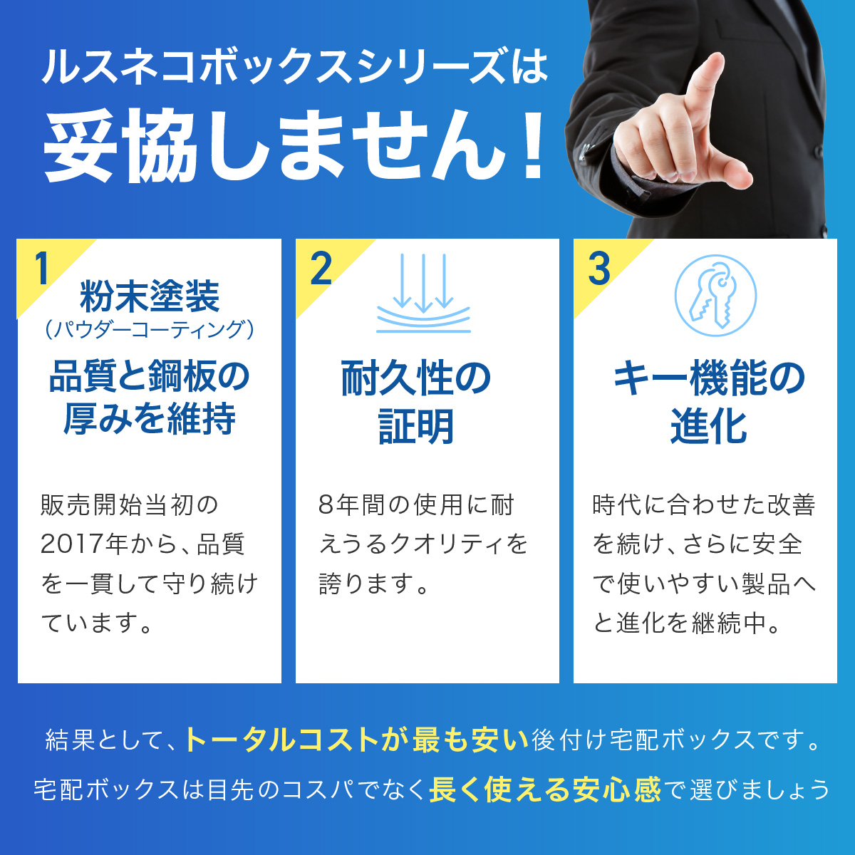 価格で選ぶな 長く使える宅配ボックス 使いやすいキー 専用ベースが設置場所のお悩みを解決! お選びいただいた方の声 アイボリーホワイト/チョコレートブラウン ブラック/アーモンドベージュ グレイッシュブルー/フォレストグリーン 三冠達成! 宅配のお悩み ルスネコボックスが解決! ユーザーレビュー ゆったり大容量 100サイズの荷物もOK 水やお米もOK これだけ入っちゃう セキュリティ対策もバッチリ スムーズな投函と取り出しが可能 高品質パウダーコーティング塗装 抜群の防水性 鋼板の厚さが他社比17%UP 安心・安全にも配慮 印鑑ケース2箇所 ルスネコがある日常1 ルスネコがある日常2 ルスネコがある日常2 ゼロリターンに拘る理由 組み立て動画をご覧ください