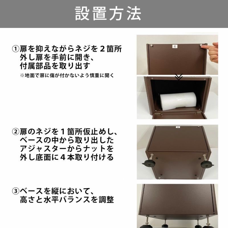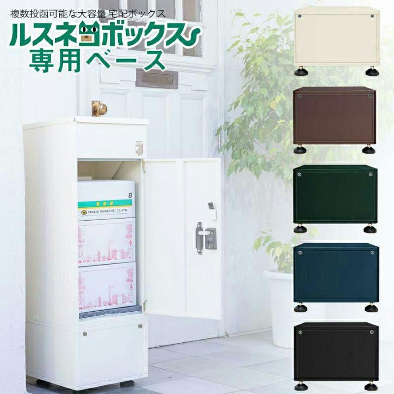 専用ベースを設置する事で本体の取り出し口が高くなり、屈むことなく荷物の出し入れがラクラク 傾斜面での設置も安定します。 また、アンカー施工ができない場所での転倒防止や積雪や浸水が心配な場所での設置にもお役立ていただけます。
