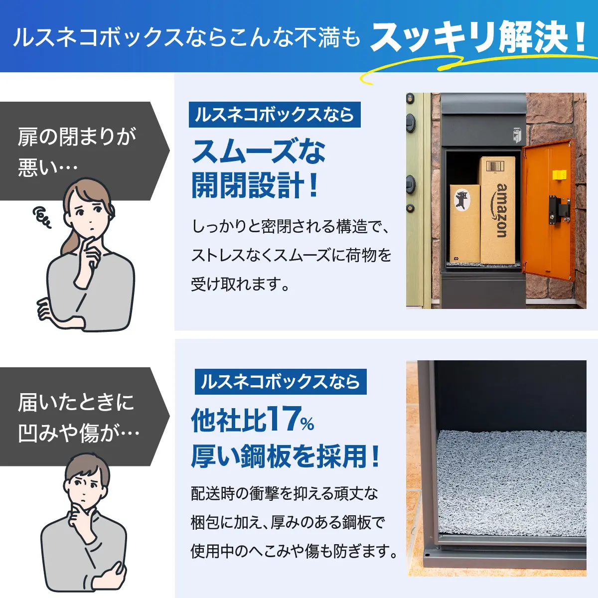 宅配ボックスは、鍵のかかる安全な空間で荷物を保管するため、これらのトラブルを大幅に軽減できます。